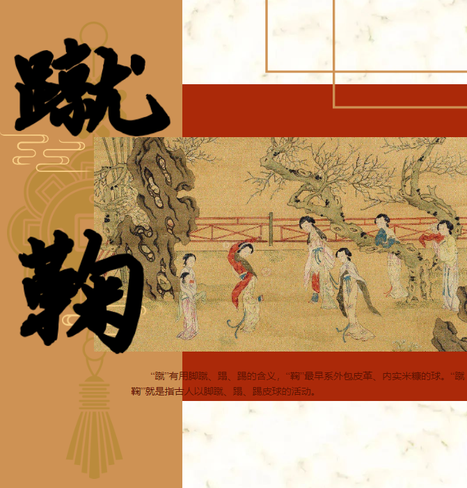 蹴鞠,是现在足球的前身。据史料记载,在战国时期中国民间就流行娱乐性的蹴鞠游戏,从汉代开始蹴鞠成为兵家练兵之法,宋代出现了蹴鞠组织与蹴鞠艺人,清代开始流行冰上蹙鞠。蹴鞠可以说是中国古代体育运动流传久远、影响较大的一朵奇葩。
