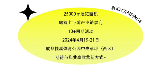 25000㎡展览面积、露营上下游产业链展商、10+同期活动 2024年4月19-21日成都桂溪体育公园中央草坪(西区) 期待与您共享露营新方式~