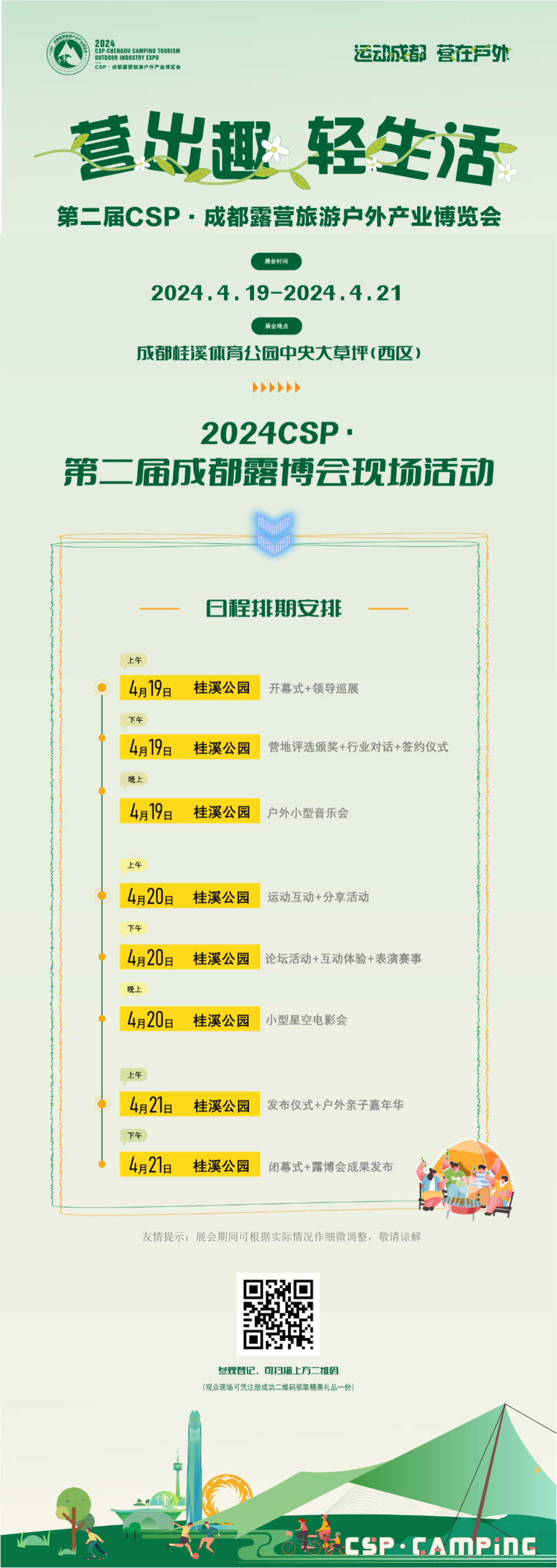 4月19日-21日,2024 CSP·成都露营旅游户外产业博览会将在成都桂溪体育公园举办。