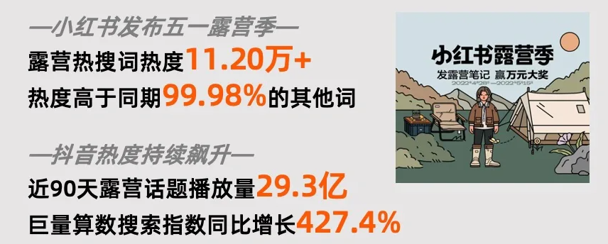 据客观数据显示,2023年小红书社区露营相关笔记发布量同比增长271%,露营相关笔记同比增长170%。